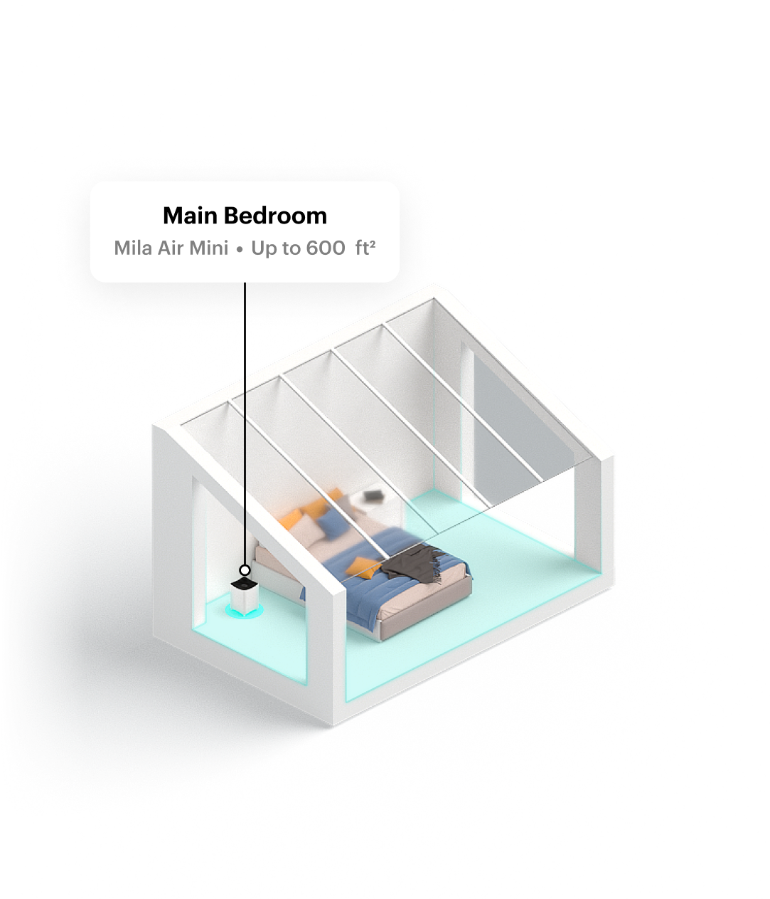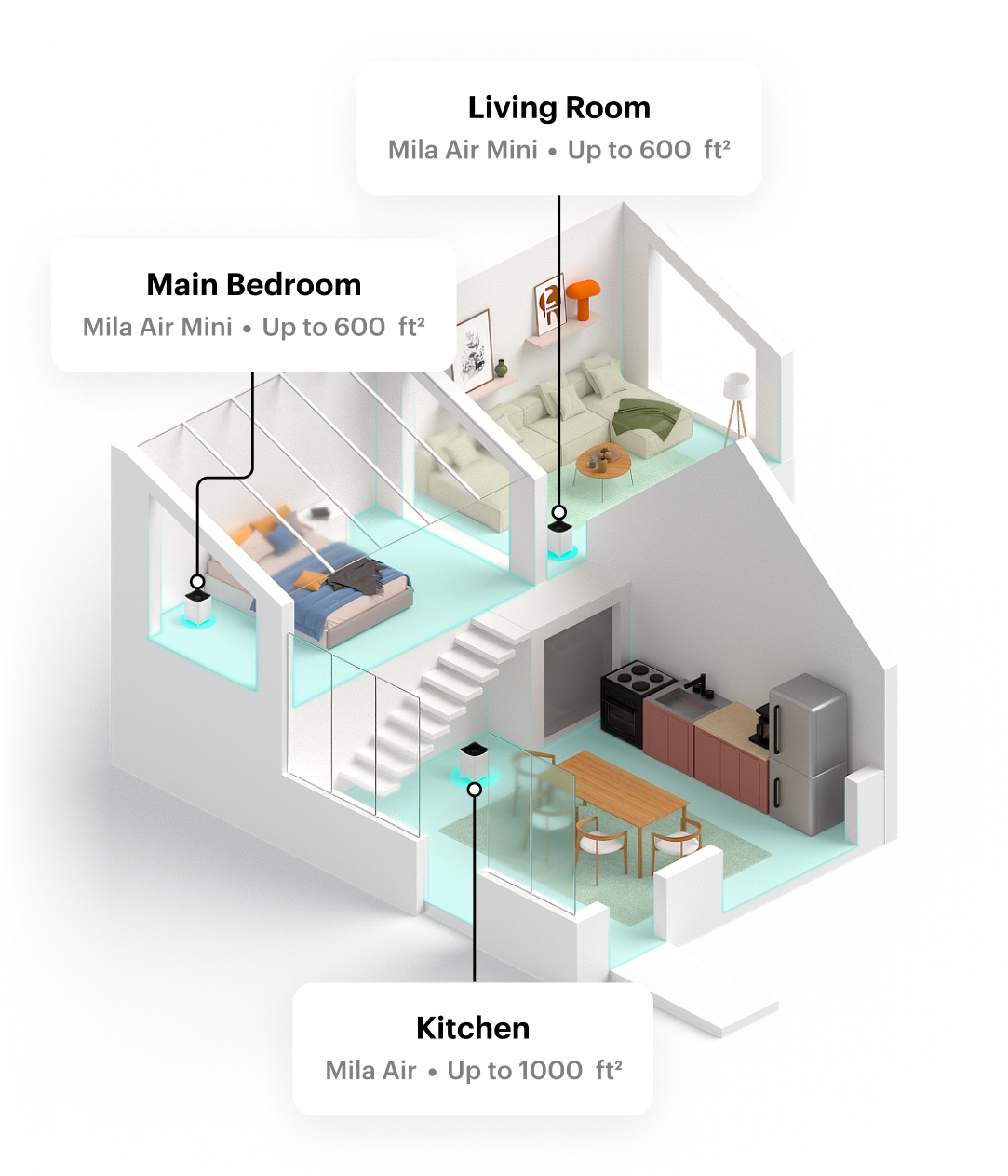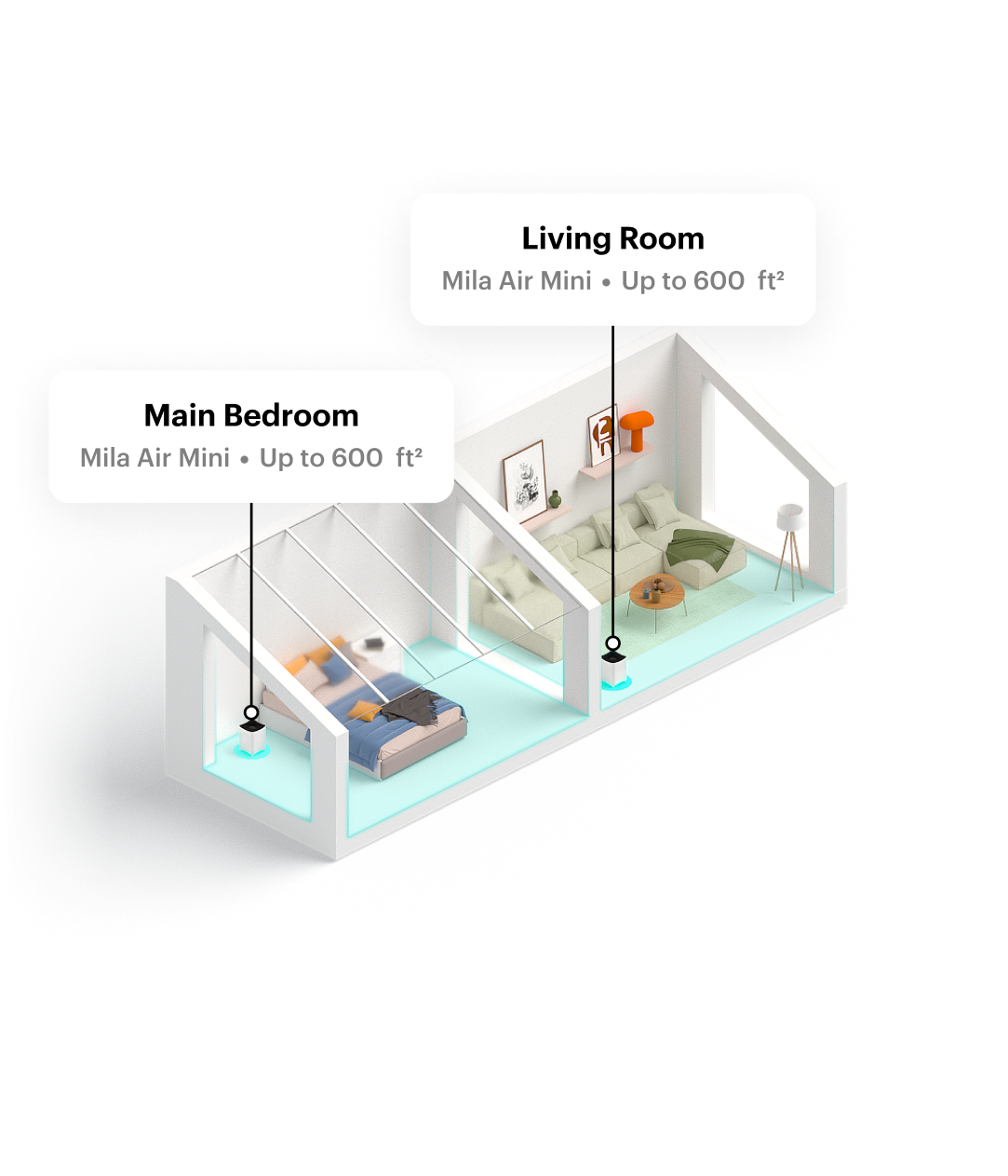 Team up our 2 purifiers to clean your whole crib. Let Mila Air handle larger spaces up to 1000 ft2 while Air Mini tackles smaller rooms up to 714 ft2. A Mila in every room is a noble commitment to breathing clean. 🫡